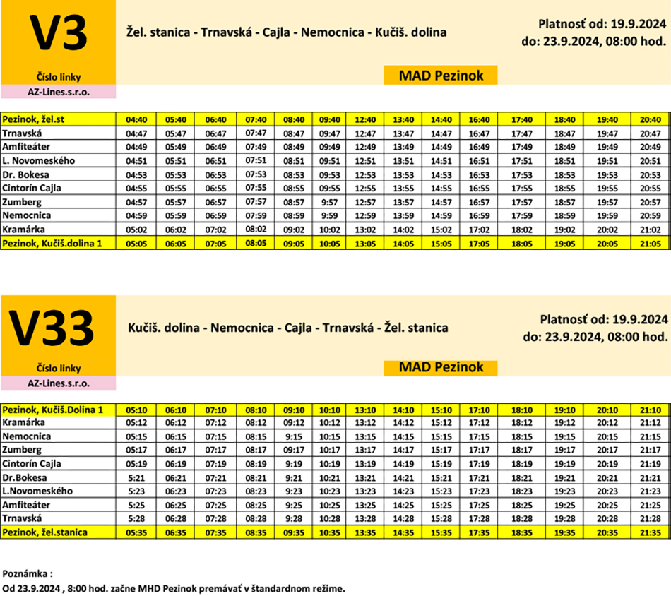 Mesto Pezinok v súvislosti s uzáverami ulíc počas Vinobrania 2024 pozastavuje prevádzku liniek MAD Pezinok číslo 1/11, 2/22 a 44. Linka 3/33 zo Železničnej stanice smer Kučišdorfská dolina bude premávať aj naďalej, avšak po zmenenej trase (grafikon). Linka 3/33 bude zastavovať na zastávkach Pezinok, žel. stanica – Trnavská – Amfiteáter – L. Novomeského – Dr. Bokesa – Cintorín Cajla – Zumberg – Nemocnica – Kramárka – Pezinok, Kučišdorfská dolina a späť.